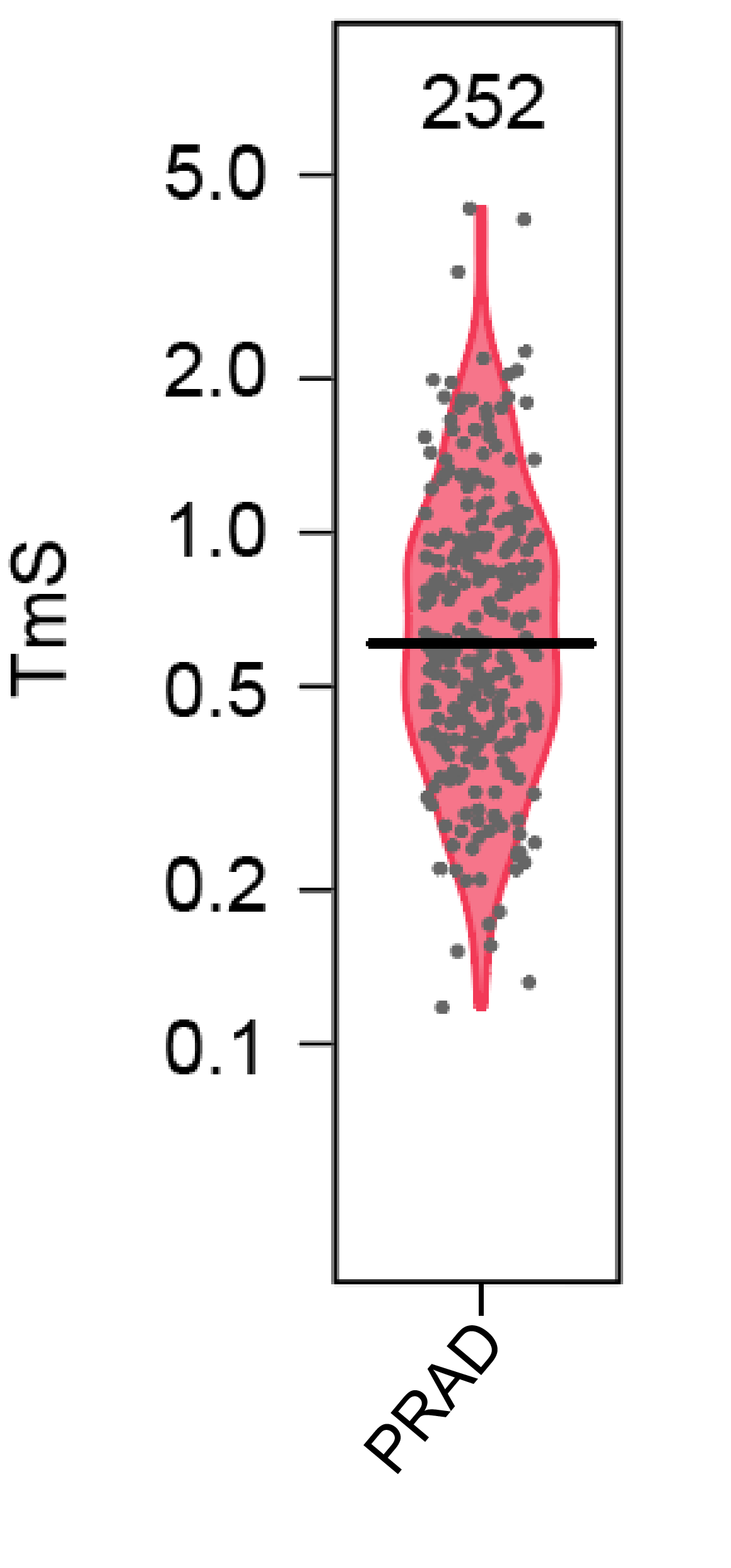 Consensus.TmS = sqrt(exp(TmS.df$TmS.ASCAT.log2)*exp(TmS.df$TmS.ABSOLUTE.log2))The estimated TmS values for TCGA PRAD tumor samples are shown in the violin plot below.