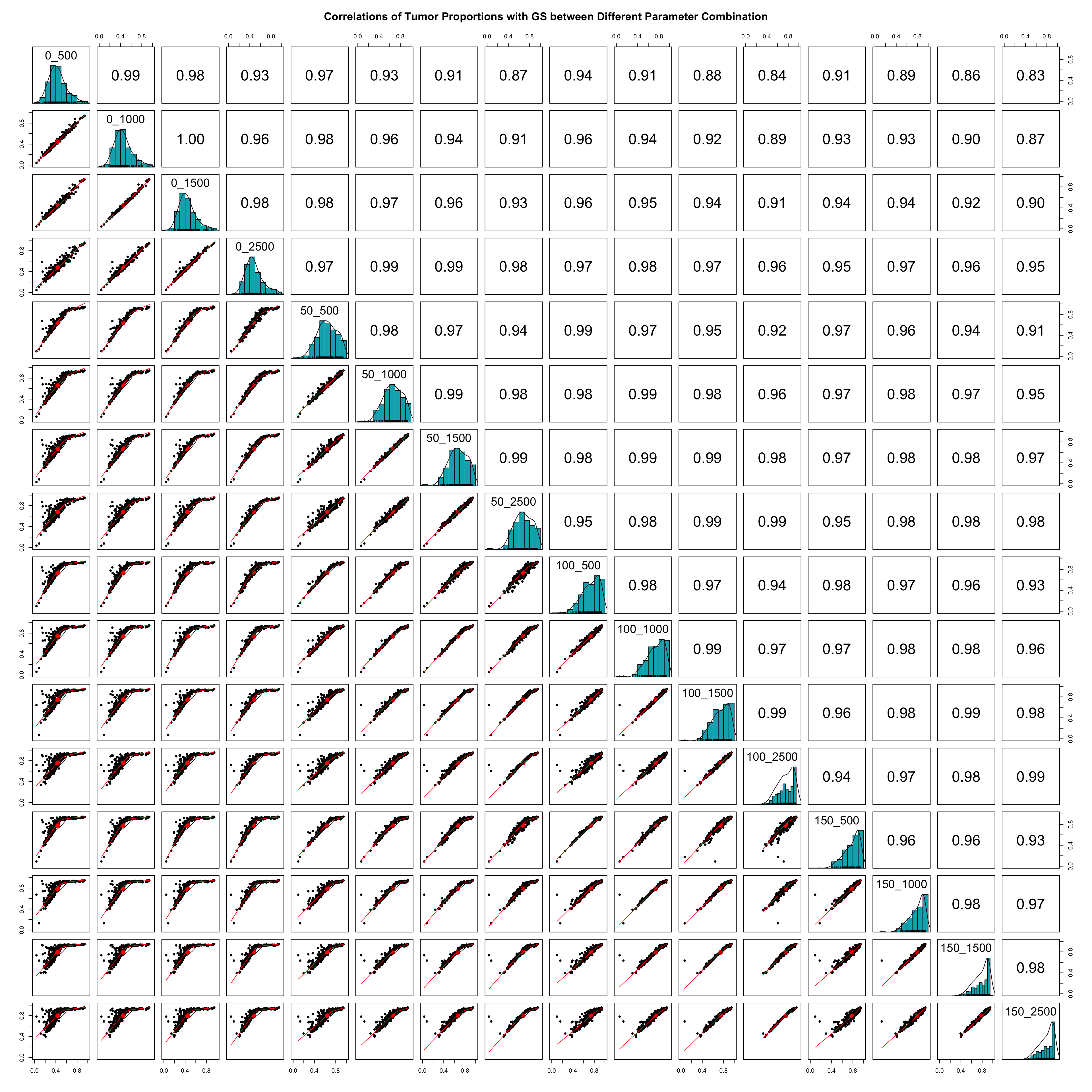 colnames(PiT_GS_PRAD) <- row_namesThis step saves the deconvolution results (PiT) into a dataframe with columns named after the combination of the number of spike-ins and number of genes selected. Then one can calculate and plot the pairwise correlations of estimated tumor proportions across different parameter combinations as shown in the next slide.